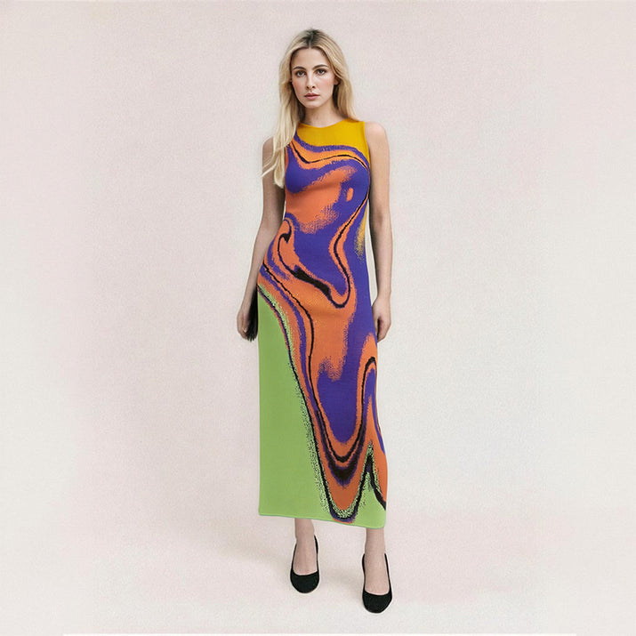 Multi color abstract jacquard knitted dress with design sense, slim fit, hip hugging, round neck, sleeveless vest skirt